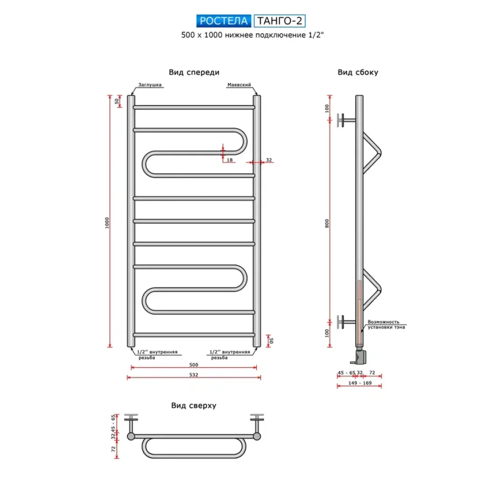 Полотенцесушитель водяной Ростела Танго 2 500x1000 1/2" нижнее подключение