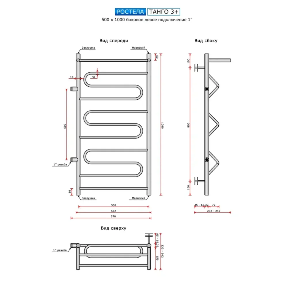 Полотенцесушитель водяной Ростела Танго 3+ 500x1000 1" боковое левое подключение