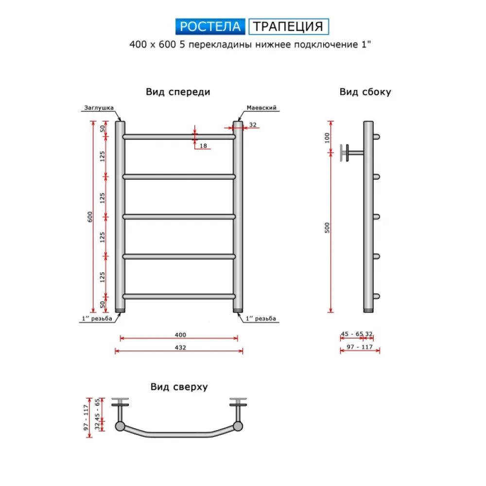 Тип: водяной , Форма: лесенка , Материал: нержавеющая сталь , Подключение: нижнее , Посадочное (межосевое) расстояние: 400 мм, Посадочный диаметр: 1 ", Высота: 60 см, Ширина: 40 см, Цвет: полированная сталь , Количество ребер: 5 шт., Ребра: выгнутые
