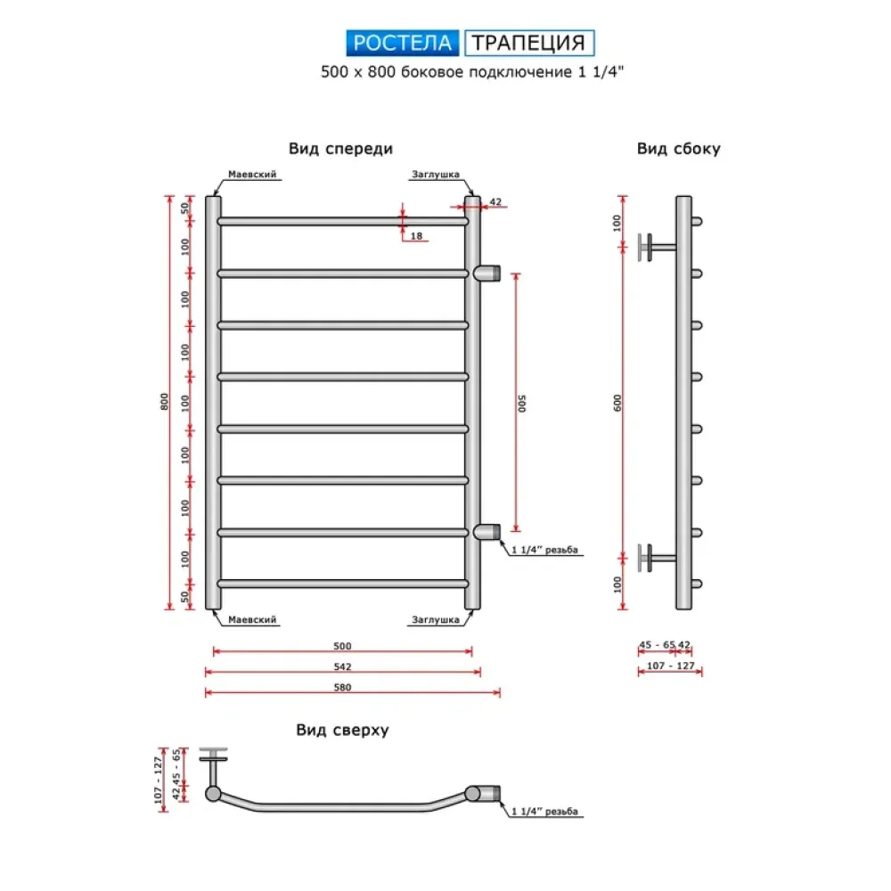 Полотенцесушитель водяной Ростела Трапеция 500x800/8 1.1/4" боковое подключение