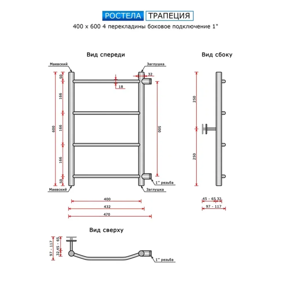 Полотенцесушитель водяной Ростела Трапеция 400x600/4 1" боковое подключение