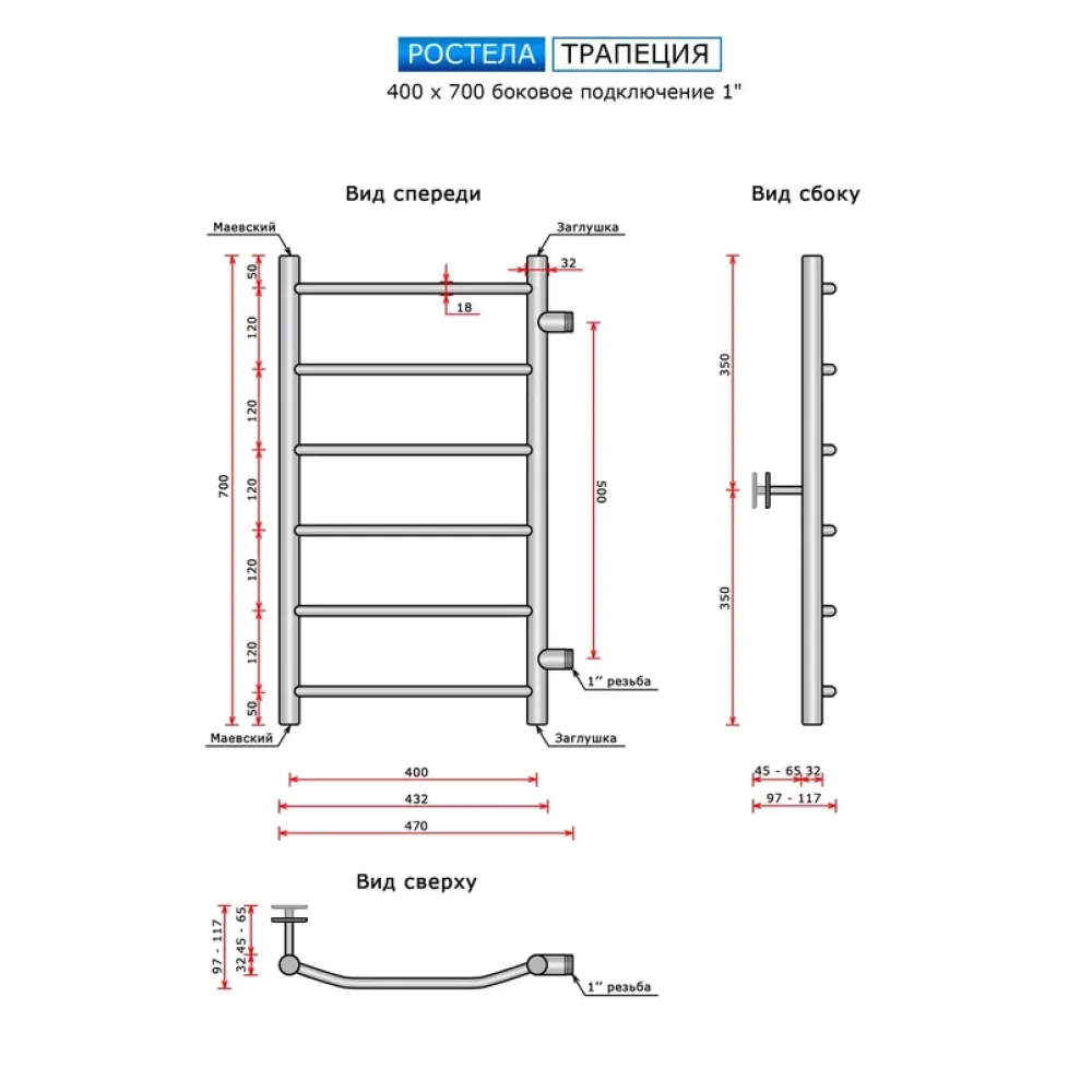 Полотенцесушитель водяной Ростела Трапеция 400x700/6 1" боковое подключение