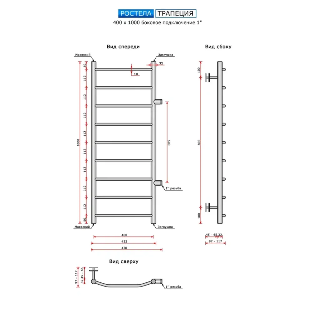 Полотенцесушитель водяной Ростела Трапеция 400x1000/9 1" боковое подключение