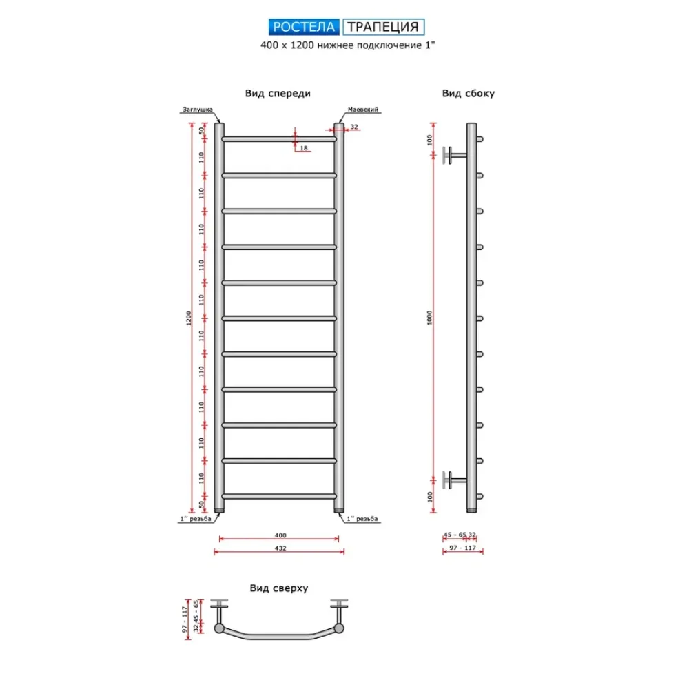 Полотенцесушитель водяной Ростела Трапеция 400x1200/11 1" нижнее подключение