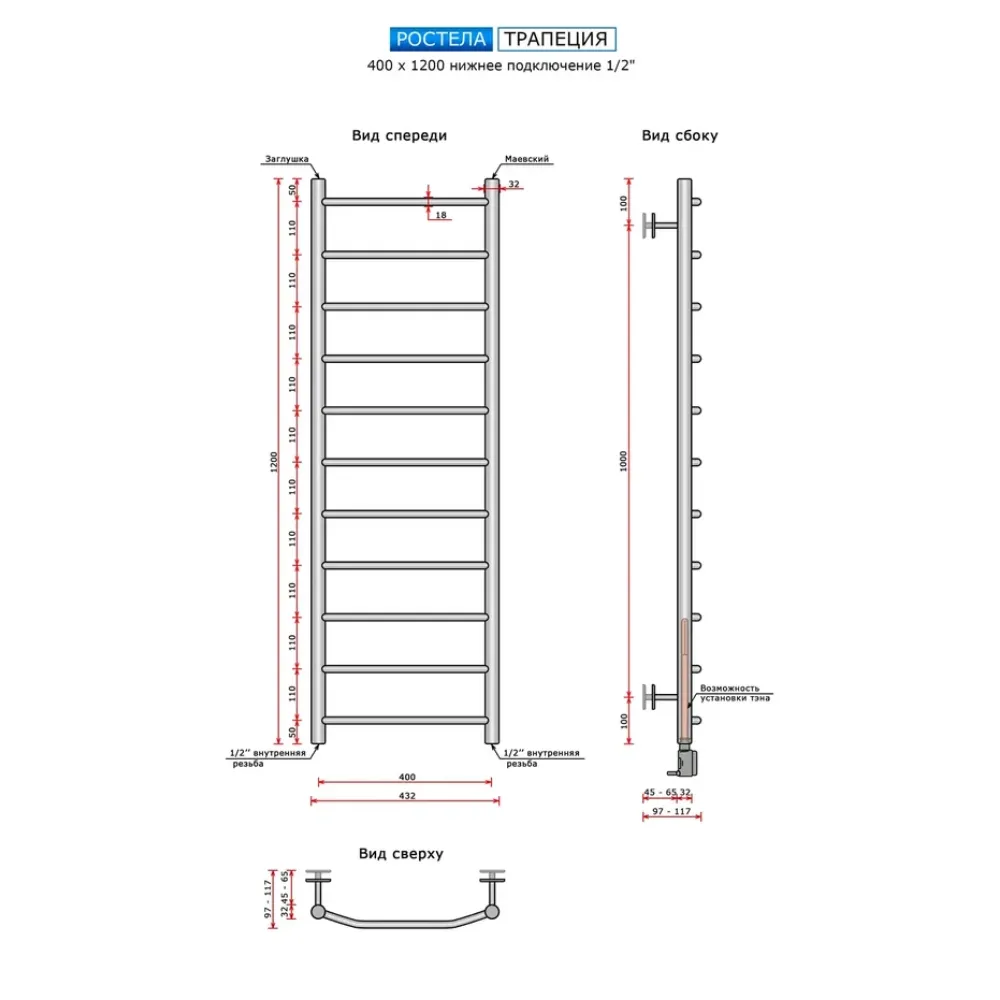 Полотенцесушитель водяной Ростела Трапеция 400x1200/11 1/2" нижнее подключение