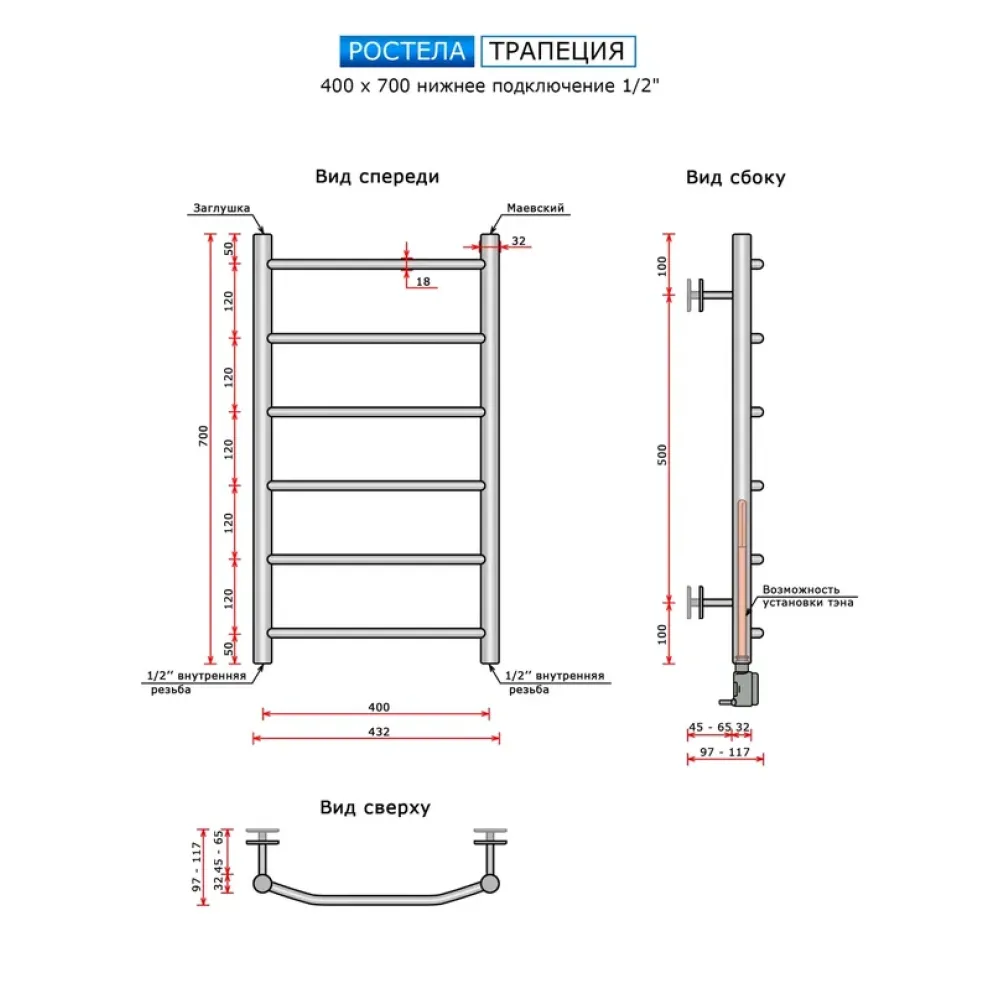Полотенцесушитель водяной Ростела Трапеция 400x700/6 1/2" нижнее подключение
