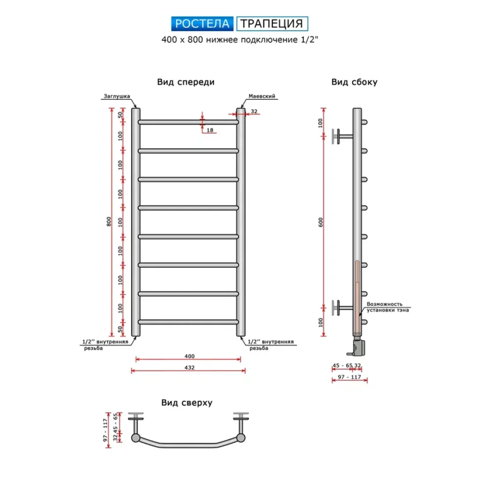 Полотенцесушитель водяной Ростела Трапеция 400x800/8 1/2" нижнее подключение