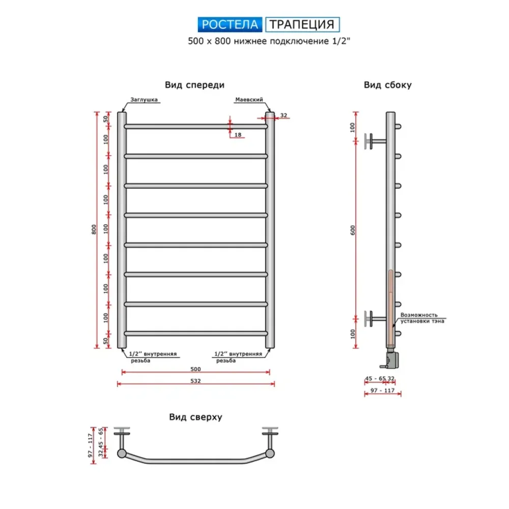 Полотенцесушитель водяной Ростела Трапеция 500x800/8 1/2" нижнее подключение