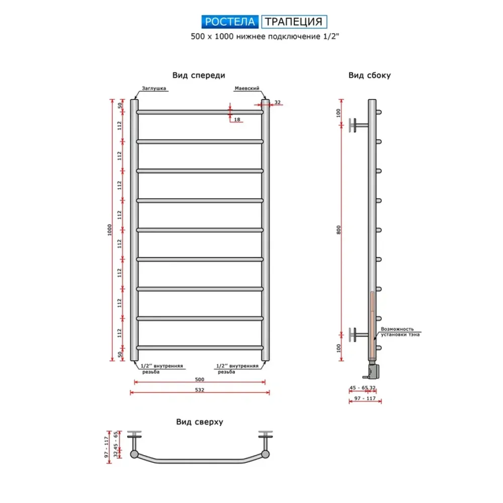 Полотенцесушитель водяной Ростела Трапеция 500x1000/9 1/2" нижнее подключение