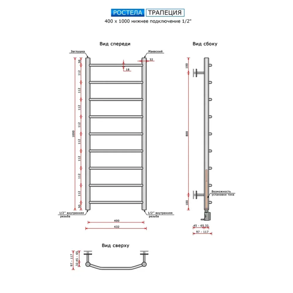Полотенцесушитель водяной Ростела Трапеция 400x1000/9 1/2" нижнее подключение