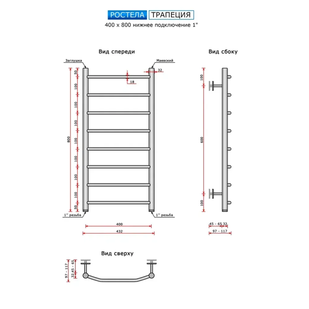 Полотенцесушитель водяной Ростела Трапеция 400x800/8 1" нижнее подключение