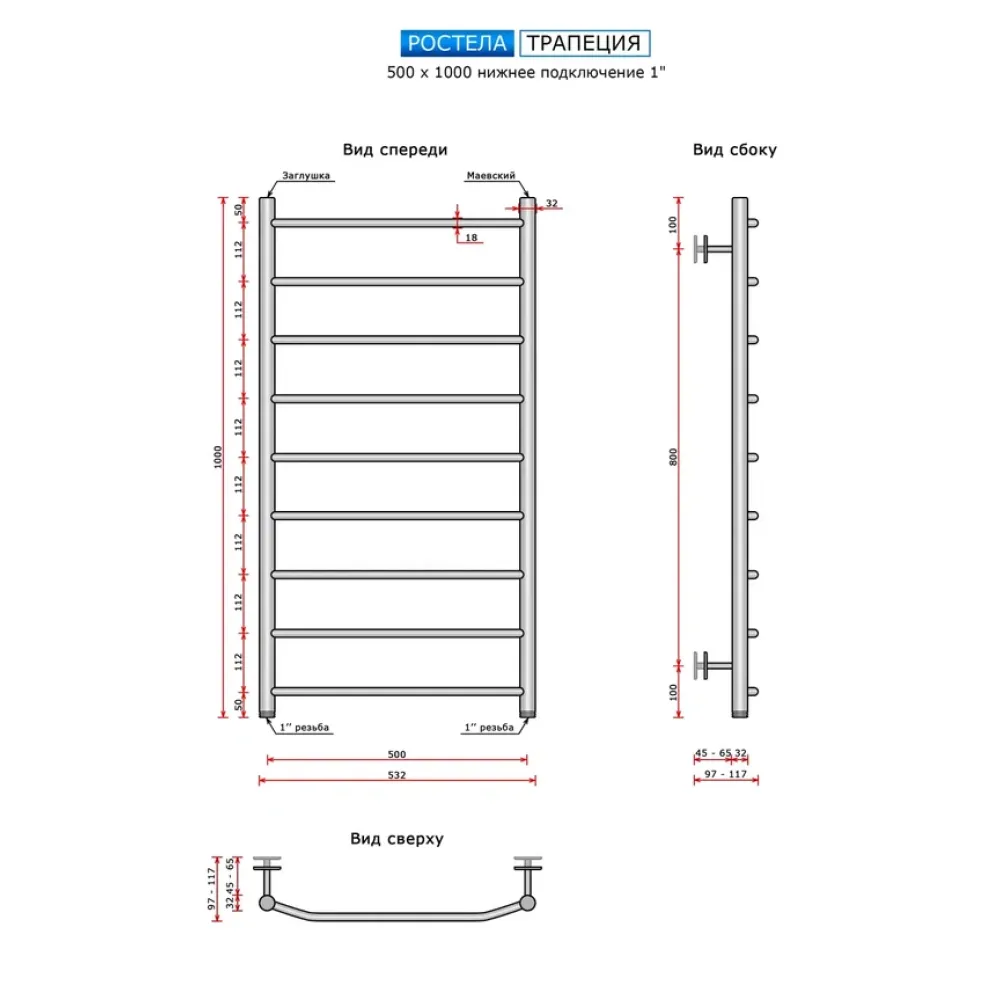 Полотенцесушитель водяной Ростела Трапеция 500x1000/9 1" нижнее подключение