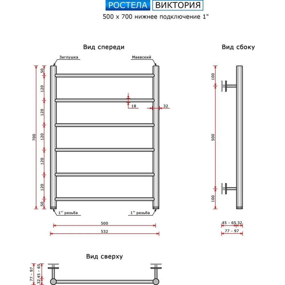 Полотенцесушитель Ростела Виктория 500x700/6 1" (Ral 9016, нижнее подключение)