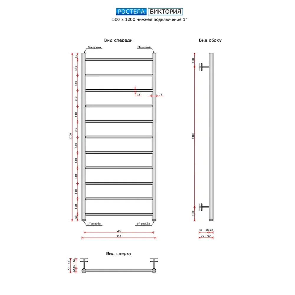 Полотенцесушитель водяной Ростела Виктория 500x1200/11 1" нижнее подключение