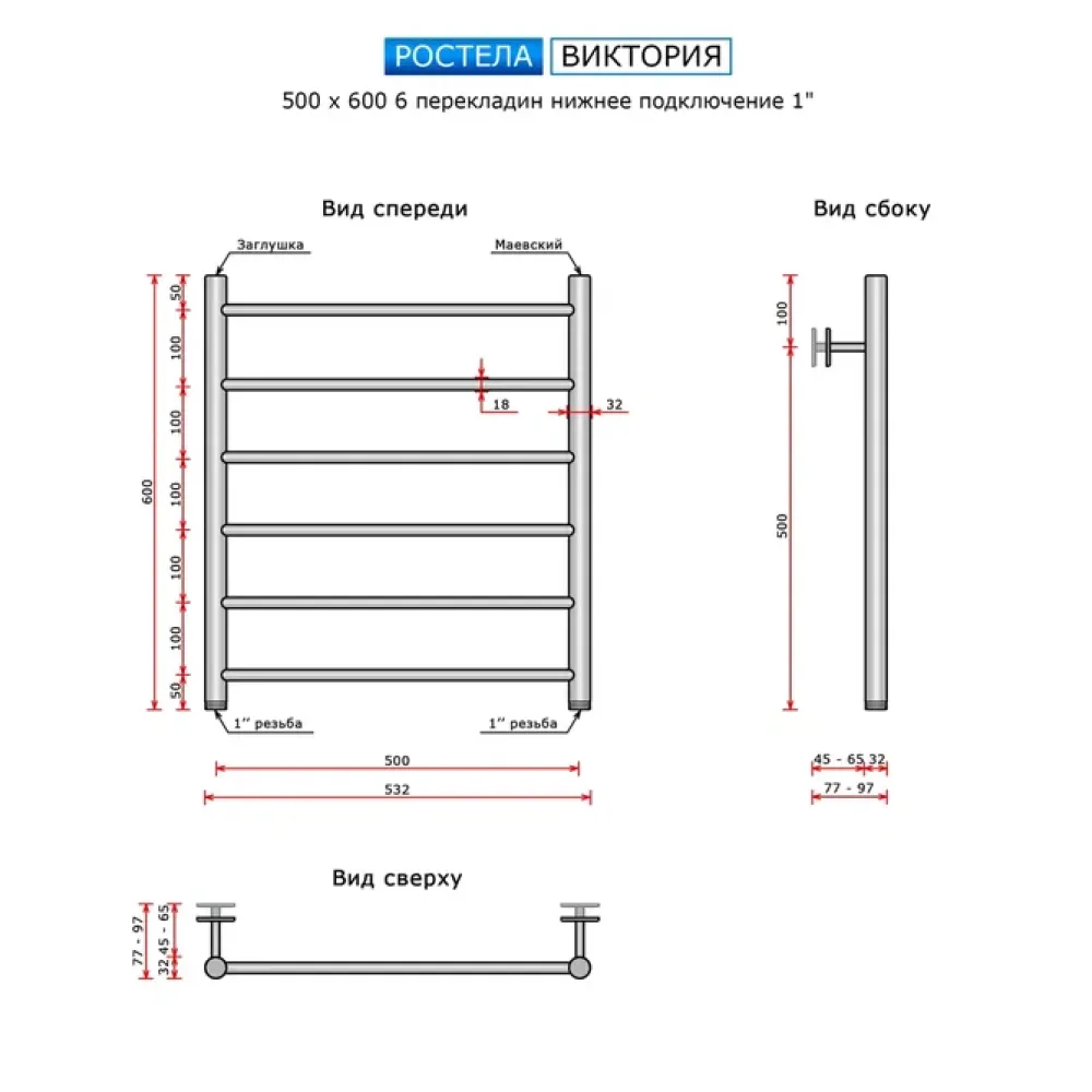 Тип: водяной , Форма: лесенка , Материал: нержавеющая сталь , Подключение: нижнее , Посадочное (межосевое) расстояние: 500 мм, Посадочный диаметр: 1 ", Высота: 60 см, Ширина: 50 см, Цвет: полированная сталь