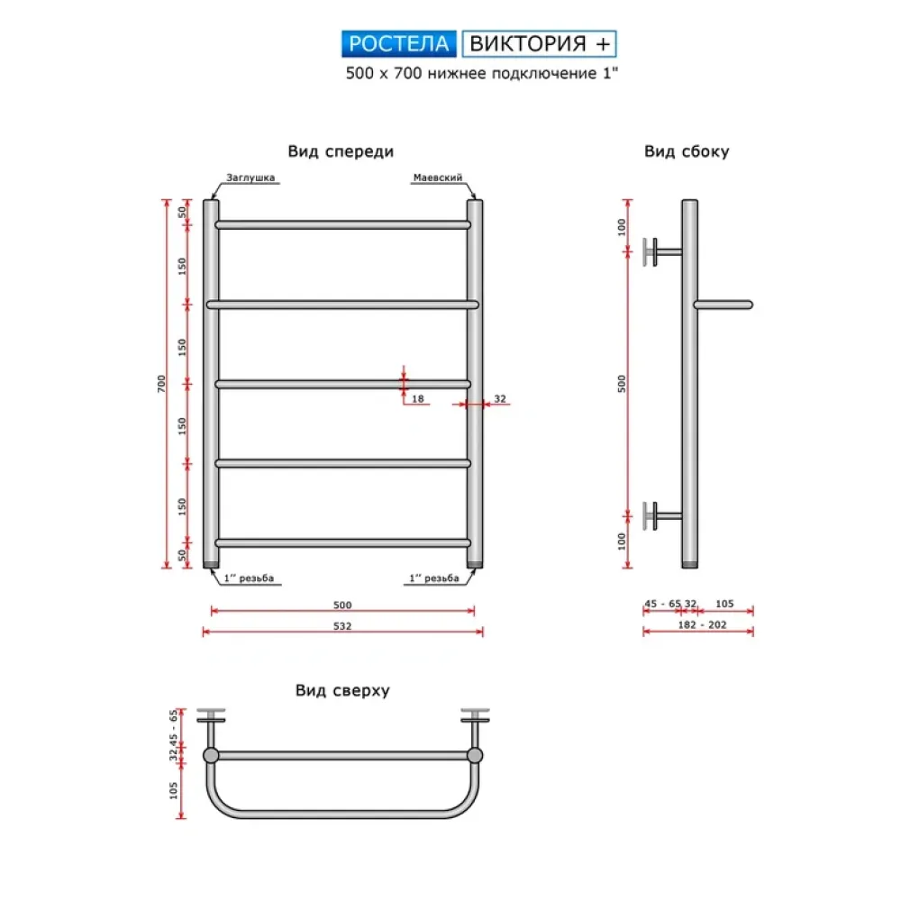 Полотенцесушитель водяной Ростела Виктория+ 500x700/5 1" нижнее подключение