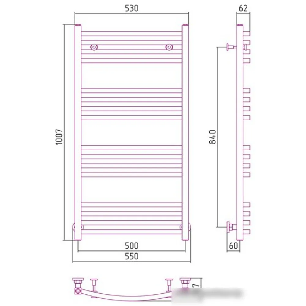 Тип: водяной , Форма: лесенка , Материал: нержавеющая сталь , Подключение: нижнее, боковое, диагональное , Посадочное (межосевое) расстояние: 500 мм, Посадочный диаметр: 3/4, 1/2 ", Высота: 100.7 см, Ширина: 55 см, Цвет: черный
