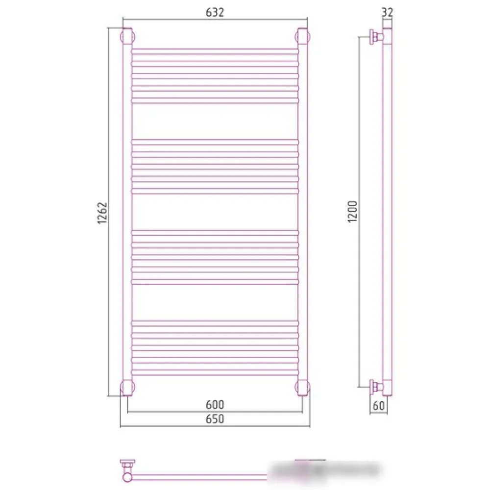 Тип: водяной , Форма: лесенка , Материал: нержавеющая сталь , Подключение: нижнее, боковое, диагональное , Посадочное (межосевое) расстояние: 600 мм, Посадочный диаметр: 3/4, 1/2 ", Высота: 126.2 см, Ширина: 65 см, Цвет: черный