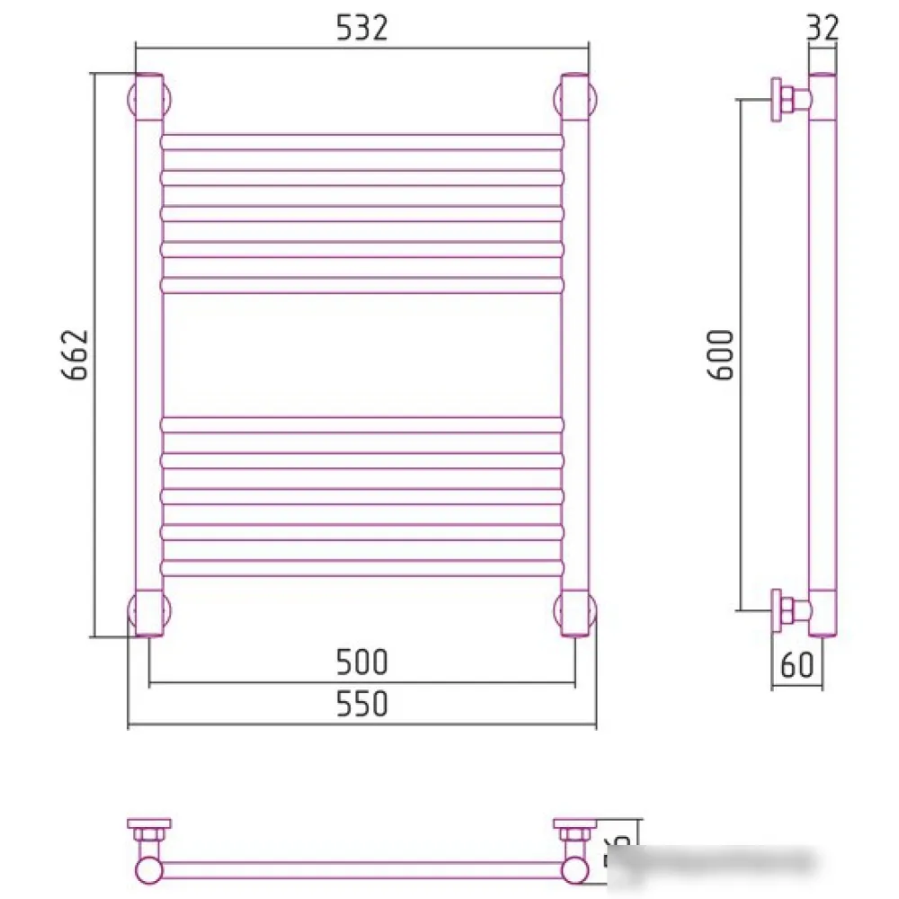 Тип: водяной , Форма: лесенка , Материал: нержавеющая сталь , Подключение: нижнее, боковое, диагональное , Посадочное (межосевое) расстояние: 500 мм, Посадочный диаметр: 3/4, 1/2 ", Высота: 66.2 см, Ширина: 55 см, Цвет: бронзовый