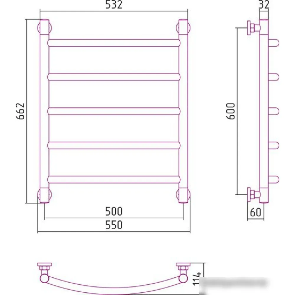 Тип: водяной , Форма: лесенка , Материал: нержавеющая сталь , Подключение: диагональное , Посадочное (межосевое) расстояние: 600 мм, Посадочный диаметр: 3/4, 1/2 ", Высота: 66.2 см, Ширина: 55 см, Цвет: полированная сталь