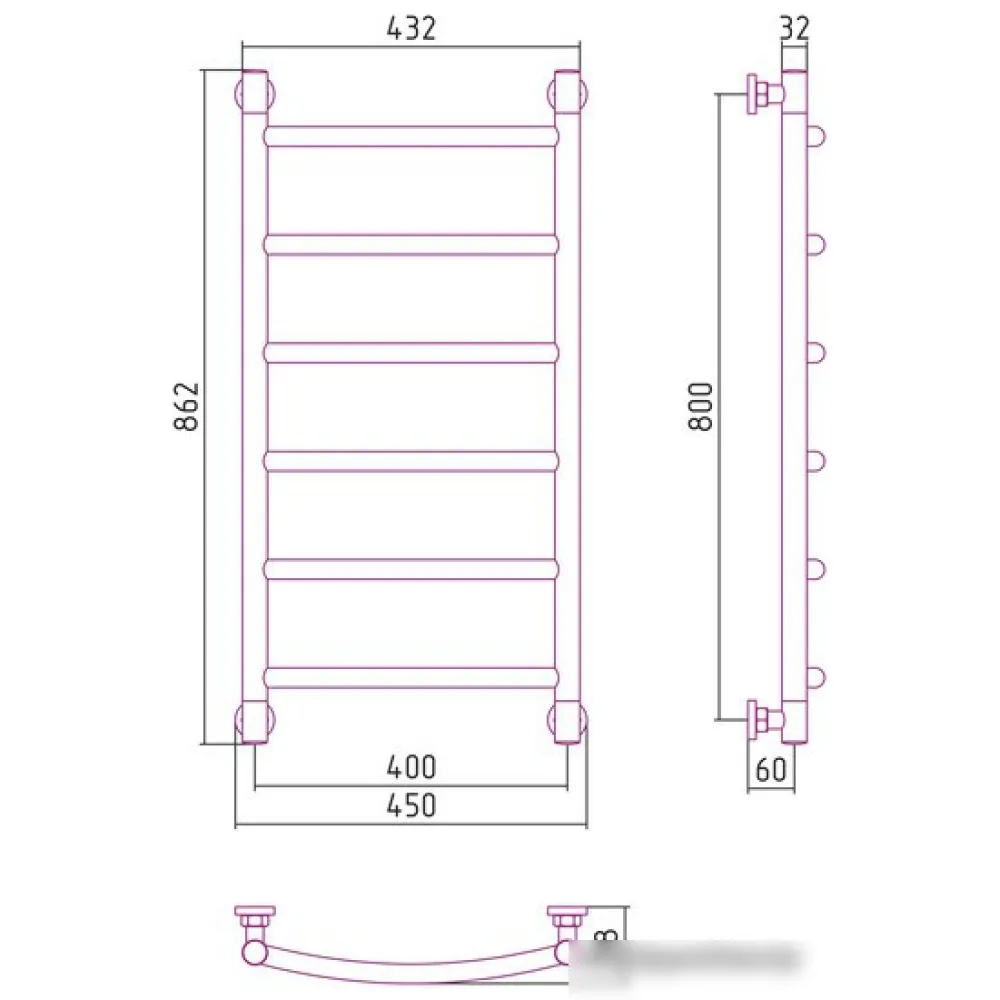 Тип: водяной , Форма: лесенка , Материал: нержавеющая сталь , Подключение: нижнее, боковое, диагональное , Посадочное (межосевое) расстояние: 400 мм, Посадочный диаметр: 3/4, 1/2 ", Высота: 86.2 см, Ширина: 45 см, Цвет: золотистый , Количество ребер: 6 шт.