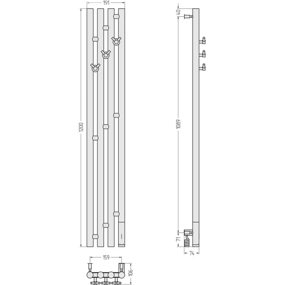 | Комплектация | ключ шестигранный, нагревательный ТЭН, саморез (3 шт.), кабель (1.5 м), дюбель (3 шт.), вешалка («Виктория»), блок управления, кронштейны телескопические |