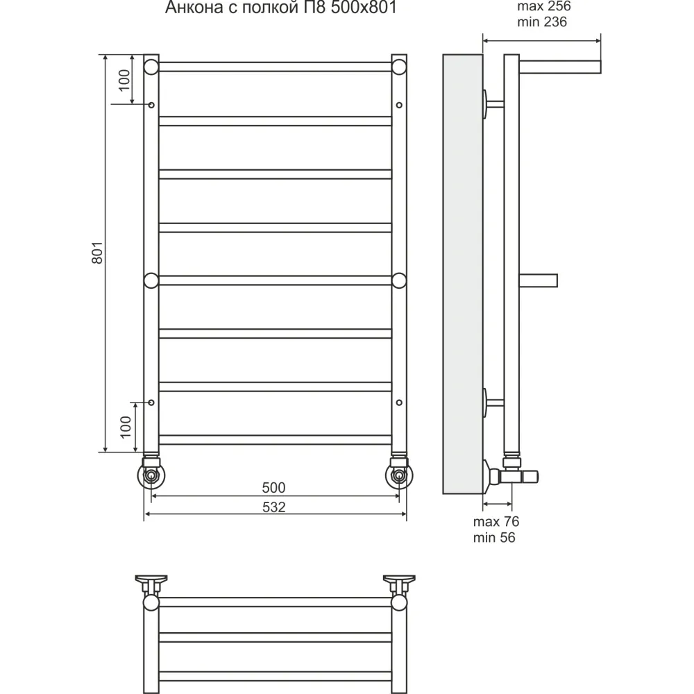 Полотенцесушитель водяной TERMINUS Анкона 500x850/8 1" с полкой, нижнее подключение