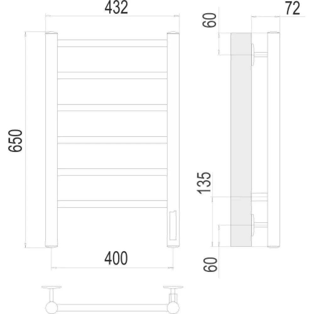 Тип: электрический , Форма: лесенка , Материал: нержавеющая сталь , Посадочное (межосевое) расстояние: 400 мм, Высота: 65 см, Ширина: 40 см, Цвет: хром , Количество ребер: 6 шт.