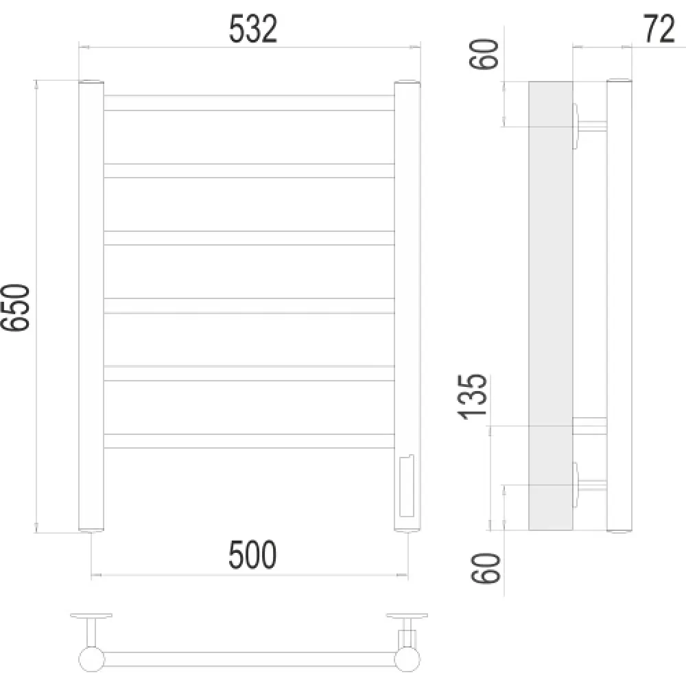 Тип: электрический , Форма: лесенка , Материал: нержавеющая сталь , Подключение: нижнее , Посадочное (межосевое) расстояние: 500 мм, Посадочный диаметр: 1/2 ", Высота: 65 см, Ширина: 50 см, Цвет: хром , Количество ребер: 6 шт.