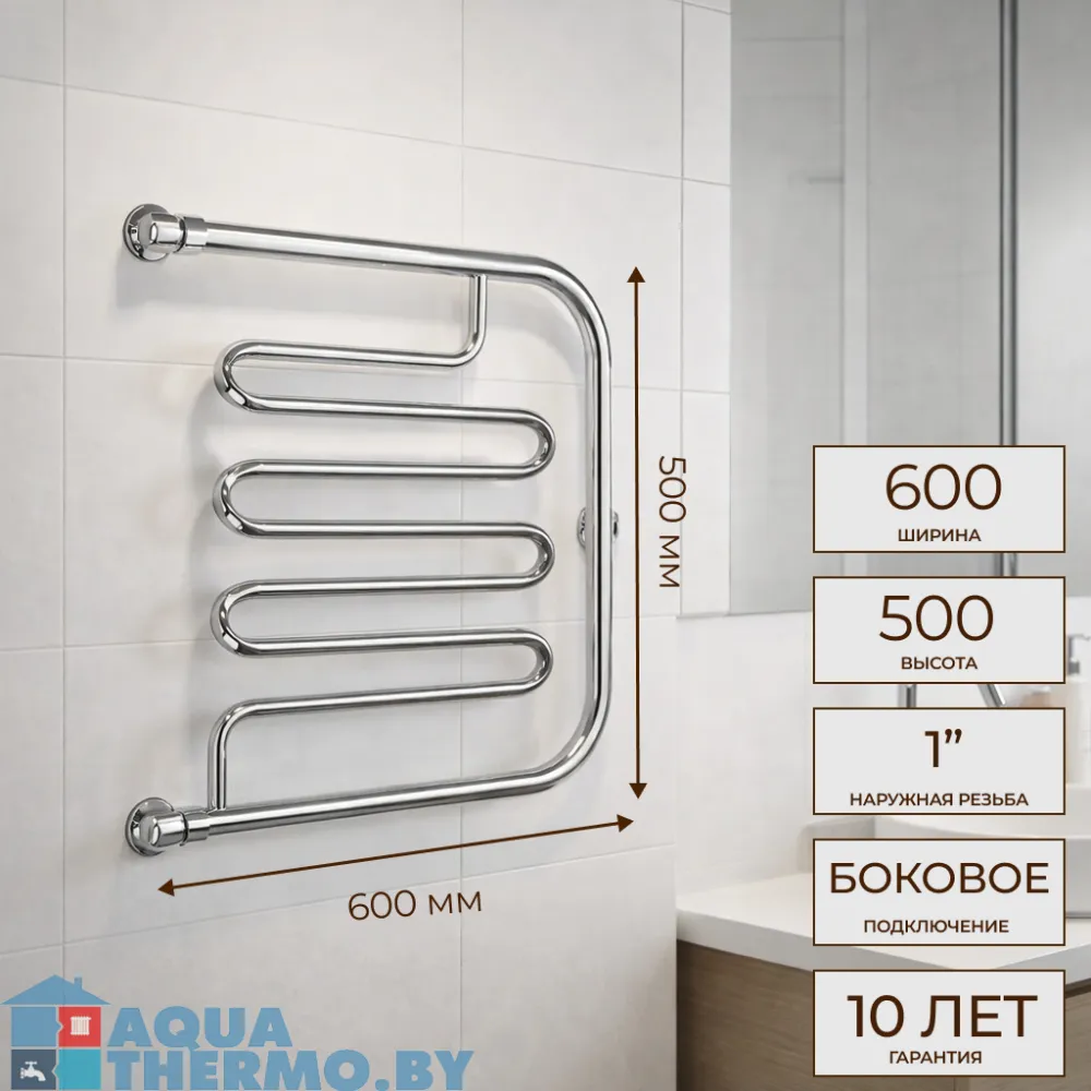 Тип: водяной , Форма: лира , Материал: нержавеющая сталь , Подключение: боковое , Посадочное (межосевое) расстояние: 500 мм, Посадочный диаметр: 1 ", Высота: 50 см, Ширина: 60 см, Цвет: хром