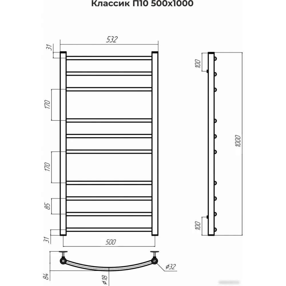 | Информация | Полотенцесушитель TERMINUS Классик П10 500x1000 - водяной тип, с нижним подключением и формой лесенки. Имеет 10 перекладин, группировку 4-3-3 и высоту 1000 мм. Ширина составляет 532 мм, межосевое расстояние - 500 мм. Теплоотдача 330 Вт, рабочее давление 3-15 Атмосфер, давление испытаний 20 Атмосфер. В комплекте телескопические держатели к стене, кран Маевского, заглушка и паспорт изделия. |