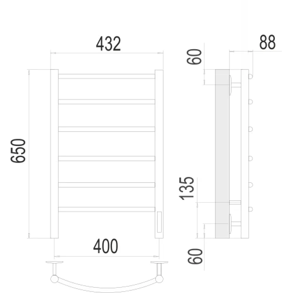 Тип: электрический , Форма: лесенка , Материал: нержавеющая сталь , Подключение: боковое , Посадочное (межосевое) расстояние: 400 мм, Высота: 65 см, Ширина: 40 см, Цвет: хром , Количество ребер: 6 шт.
