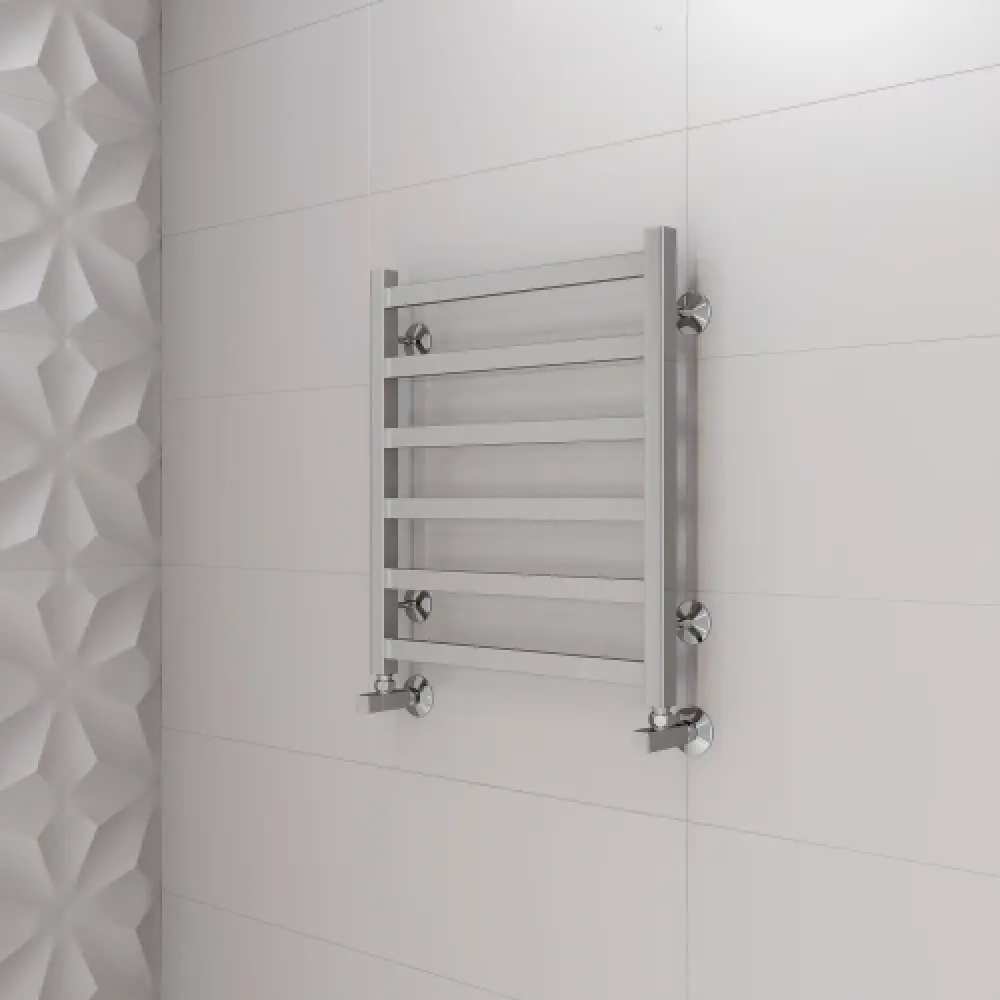 Тип: водяной , Форма: лесенка , Материал: нержавеющая сталь , Подключение: нижнее , Посадочное (межосевое) расстояние: 500 мм, Посадочный диаметр: 1 ", Высота: 60 см, Ширина: 50 см, Цвет: хром , Количество ребер: 6 шт.