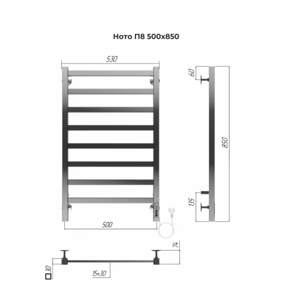 Тип: электрический , Форма: лесенка , Материал: нержавеющая сталь , Посадочное (межосевое) расстояние: 500 мм, Высота: 85 см, Ширина: 50 см, Цвет: хром , Количество ребер: 8 шт.