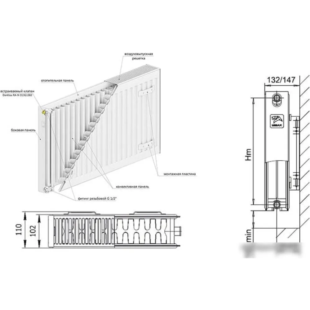 | Информация | Тип 22. С двумя рядами панелей по глубине с двумя рядами оребрения, приваренного к каждой панели с внутренней стороны, с воздуховыпускной решёткой и боковыми стенками. Комплектуется встраиваемым клапаном Danfoss RA-N 013G1382. |
