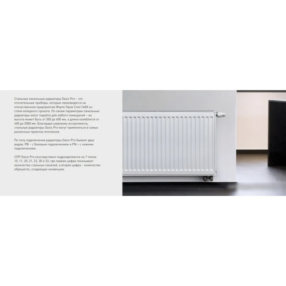 | Информация | Все панельные отопительные приборы Oasis Pro имеют высококачественное термостойкое защитно-декоративное покрытие белого цвета RAL 9016. Обладают повышенной прочностью и стойкостью к гидроударам. Для радиаторов Oasis Pro используются фитинги фирмы Berg, Германия. Высокое качество продукции обеспечивается строгим контролем всего производственного цикл. |