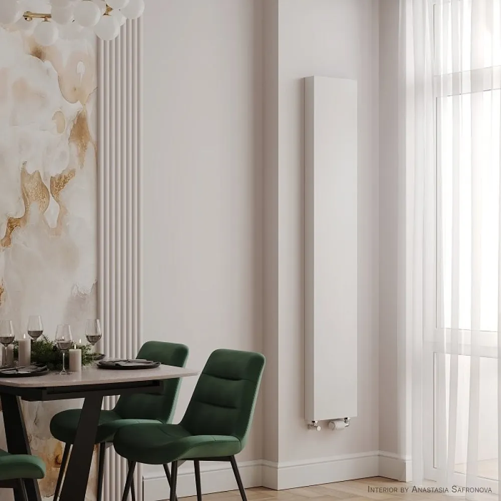 Вертикальные дизайн-радиаторы серии Flat являются разновидностью стальных панельных радиаторов для установки на узких и высоких стенах. Радиаторы выполнены из двух панелей с декоративной накладкой. В них отсутствует верхняя накладка типа «гриль». Два нижних и два верхних присоединительных отверстия с внутренней резьбой G ½ “ делают возможным подсоединение снизу, а в случае необходимости – сверху. Радиатор не имеет встроеннoй вентильной вставки.