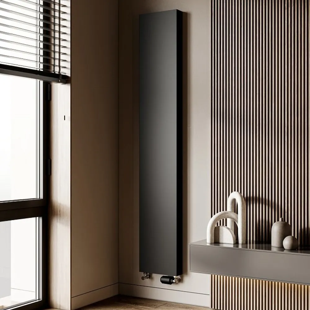 Вертикальные дизайн-радиаторы серии Flat являются разновидностью стальных панельных радиаторов для установки на узких и высоких стенах. Радиаторы выполнены из двух панелей с декоративной накладкой. В них отсутствует верхняя накладка типа «гриль». Два нижних и два верхних присоединительных отверстия с внутренней резьбой G ½ “ делают возможным подсоединение снизу, а в случае необходимости – сверху. Радиатор не имеет встроеннoй вентильной вставки.