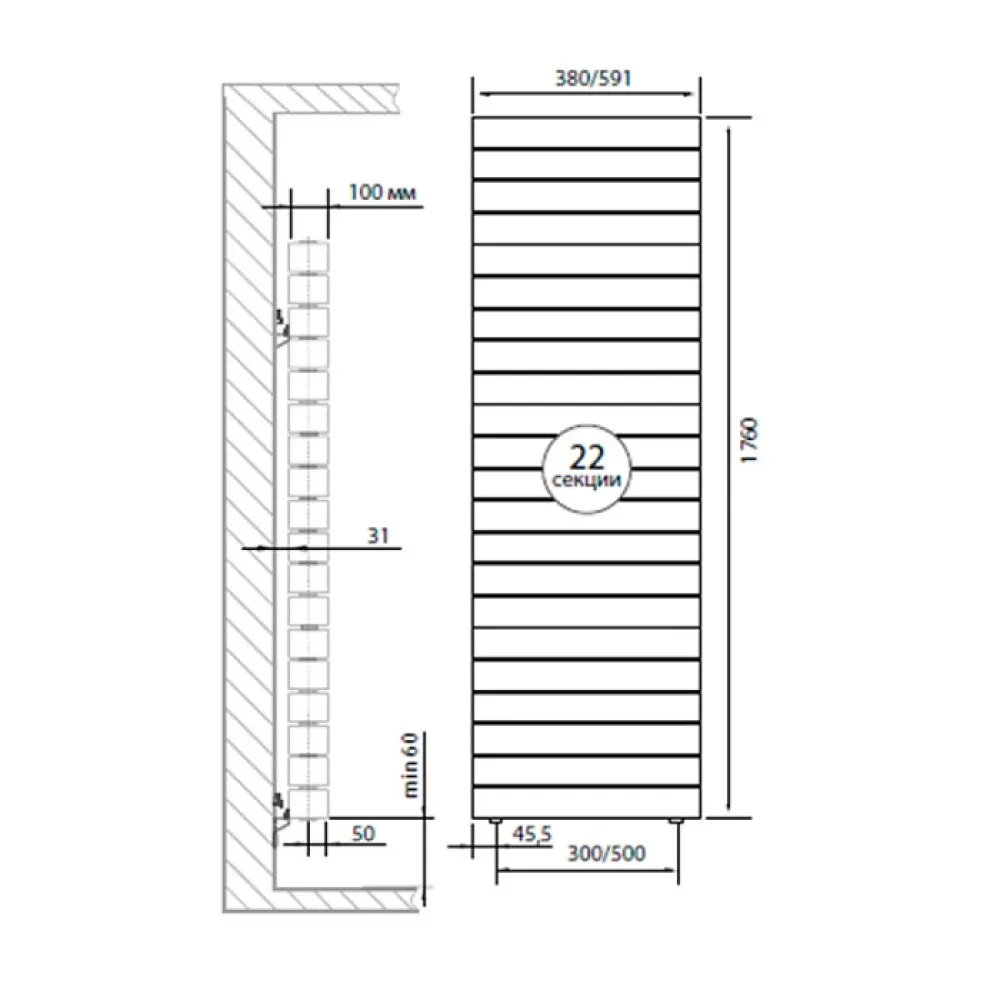 - Дополнительное оребрение на вертикальном коллекторе секции увеличивает теплоотдачу радиатора на 5%.