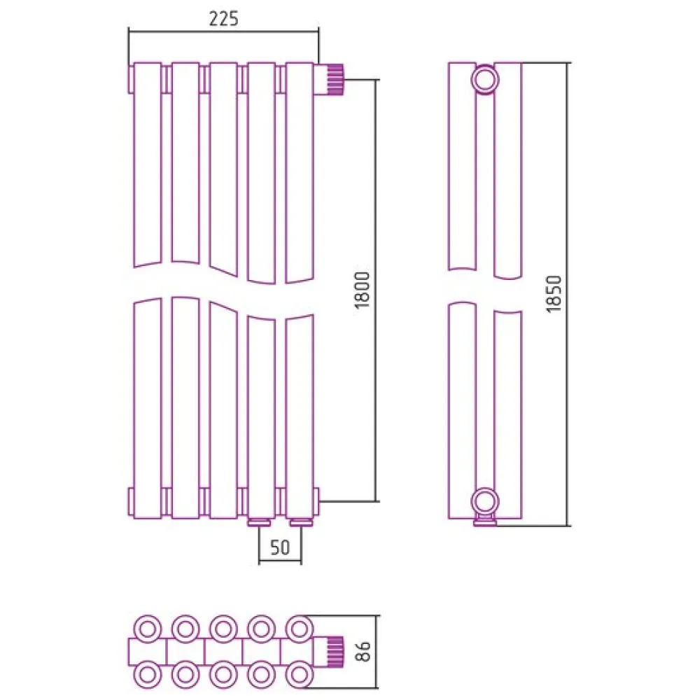 стальной трубчатый, боковое подключение, высота: 1850 мм, межосевое расстояние: 50 мм