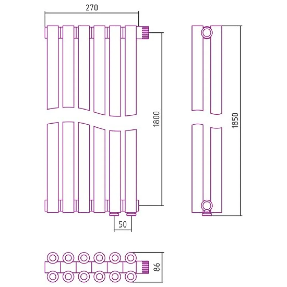стальной трубчатый, боковое подключение, высота: 1850 мм, межосевое расстояние: 50 мм