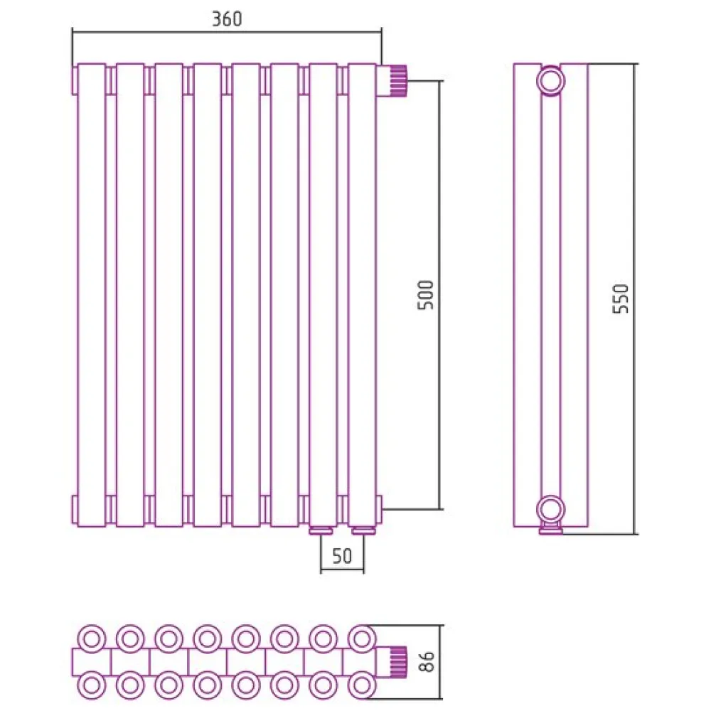 стальной трубчатый, боковое подключение, высота: 550 мм, межосевое расстояние: 50 мм