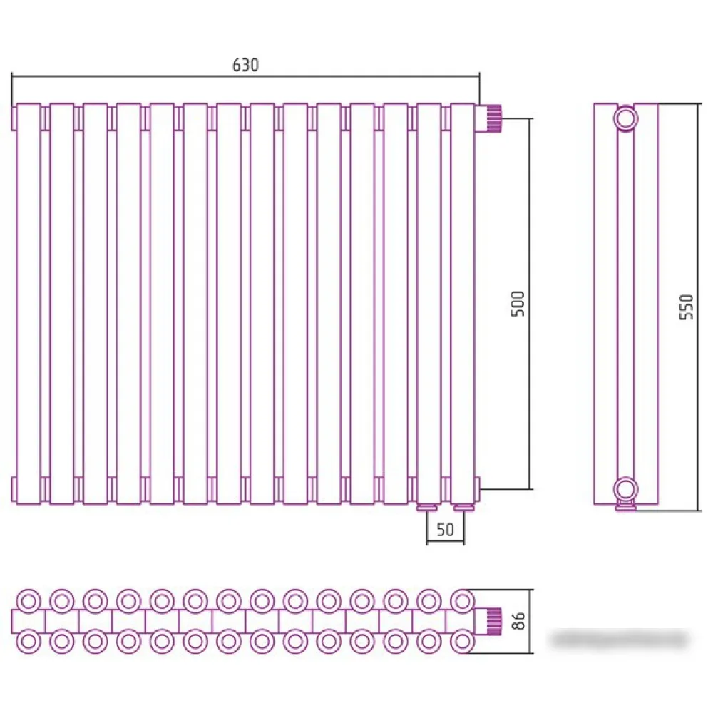 стальной трубчатый, боковое подключение, высота: 550 мм, межосевое расстояние: 50 мм