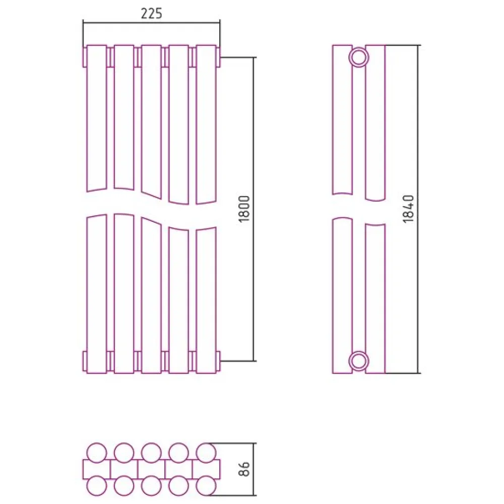стальной трубчатый, боковое/нижнее подключение, высота: 1840 мм, межосевое расстояние: 1800 мм