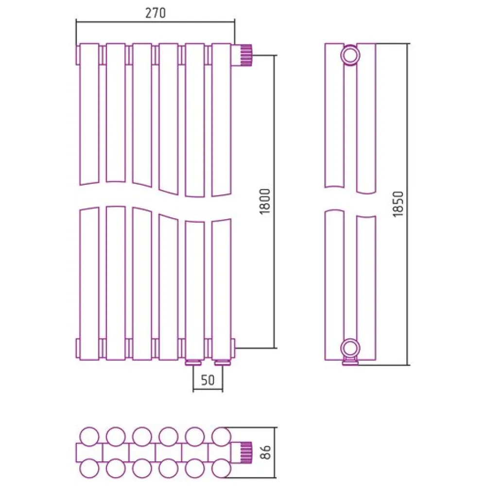 Тип: стальной трубчатый , Подключение: нижнее , Высота: 1850 мм, Посадочное (межосевое) расстояние: 50 мм, Посадочный диаметр: 3/4 "